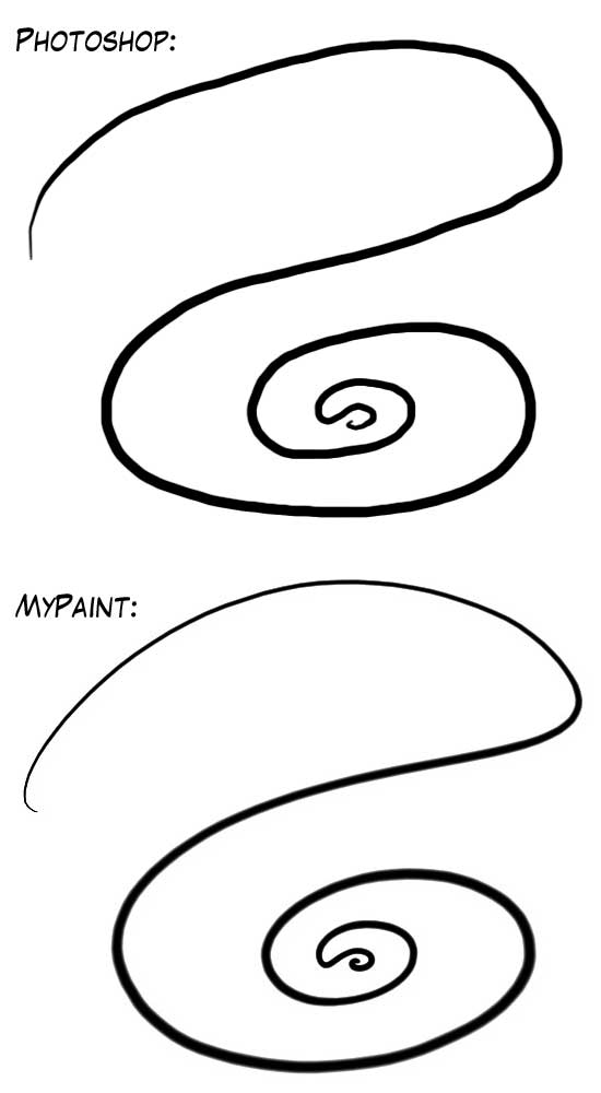 Step 2: MyPaint! Free and open source. Inking is so much faster and easier here than in Photoshop, it isn’t even funny. Try the Ico_Precise_Pen_02 brush (in the Ink set) with a boosted radius. You can even zoom way out to ink a long line, and when you zoom back in, the line will be perfectly smooth. ♥ So good.