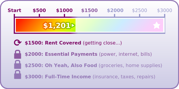 We're still working toward the $1,500/month milestone (so that my income can at least cover our rent). If you can help at all, please consider it! Even a few dollars from a few people can make a huge difference to us. ♥